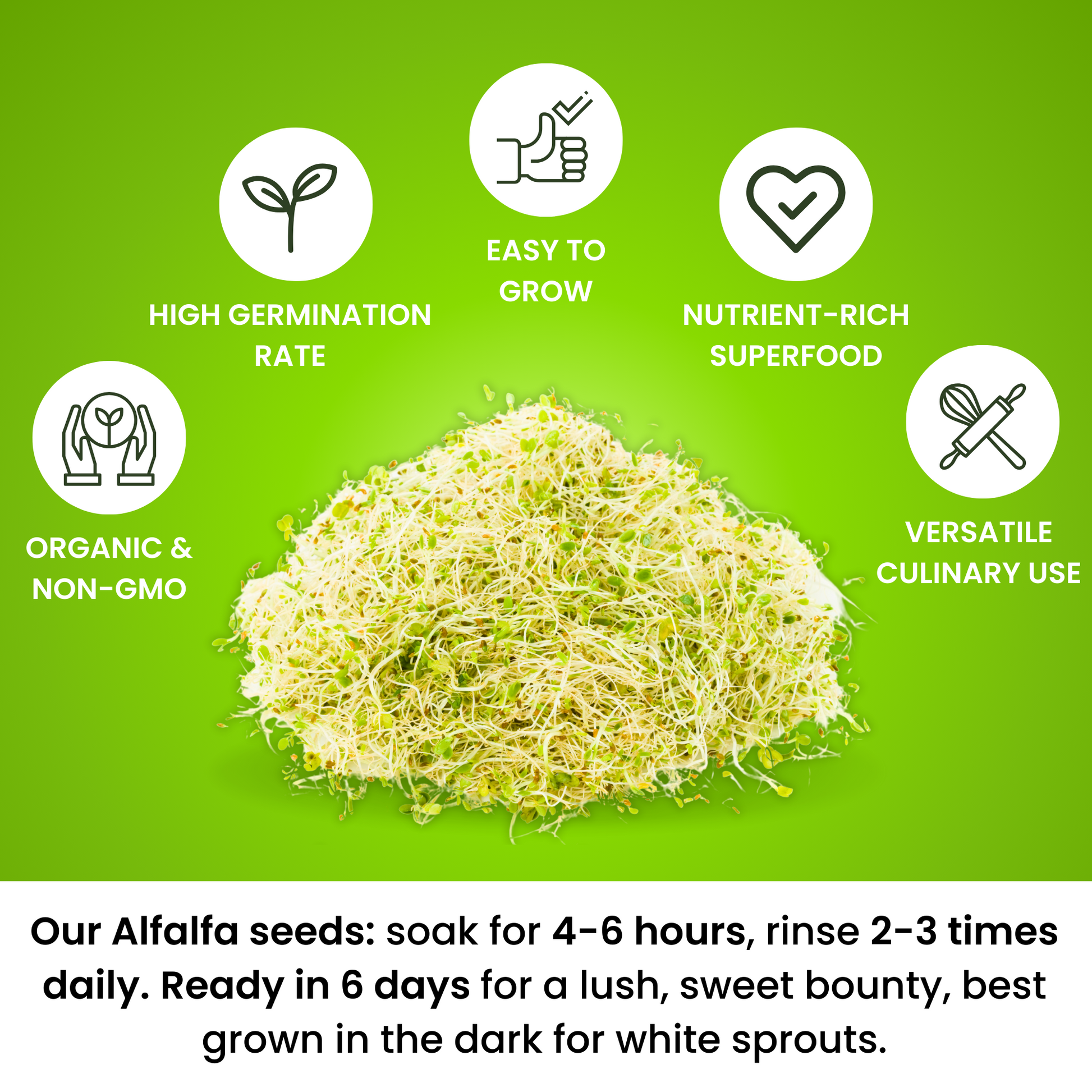 - FAST AND EASY SPROUTING: Enjoy fresh alfalfa sprouts in just 3-5 days with our seeds that have a high germination rate, making it simple for anyone to grow nutritious sprouts at home.